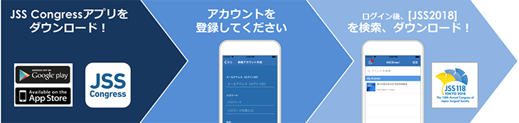 JSS Congressアプリから、第118回日本外科学会定期学術集会の情報をダウンロードしていただきます。