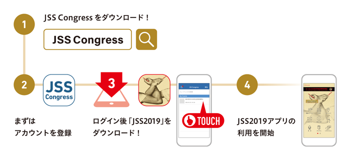 ①Apple App Store、Google Play Storeから「JSS Congress」を検索し、インストールしてください。
