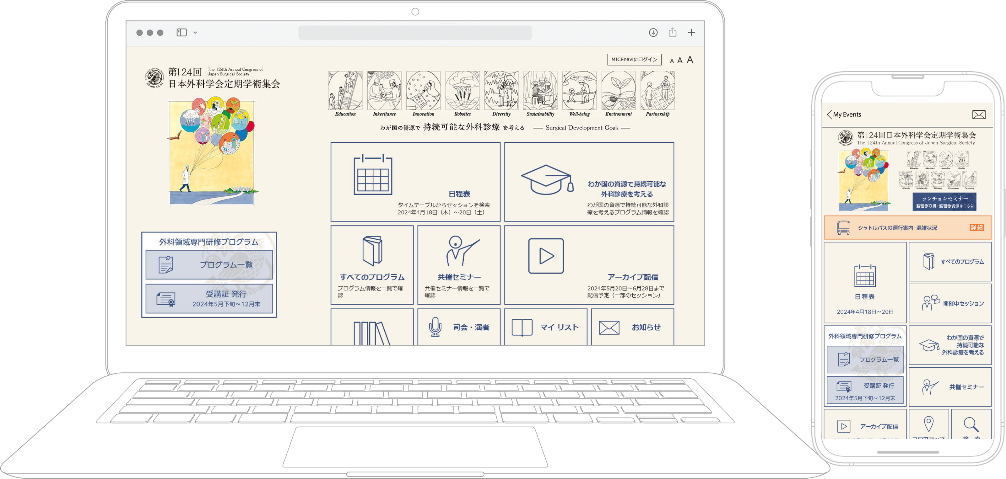 パソコンからWeb版をご覧いただくか、Apple App Store(iPhone、iPad)やGoogle Play Store(Android)にアプリ版をダウンロードしてお持ちのモバイル機器からご利用いただけますので、会場でご参会の際に是非ご利用ください。
