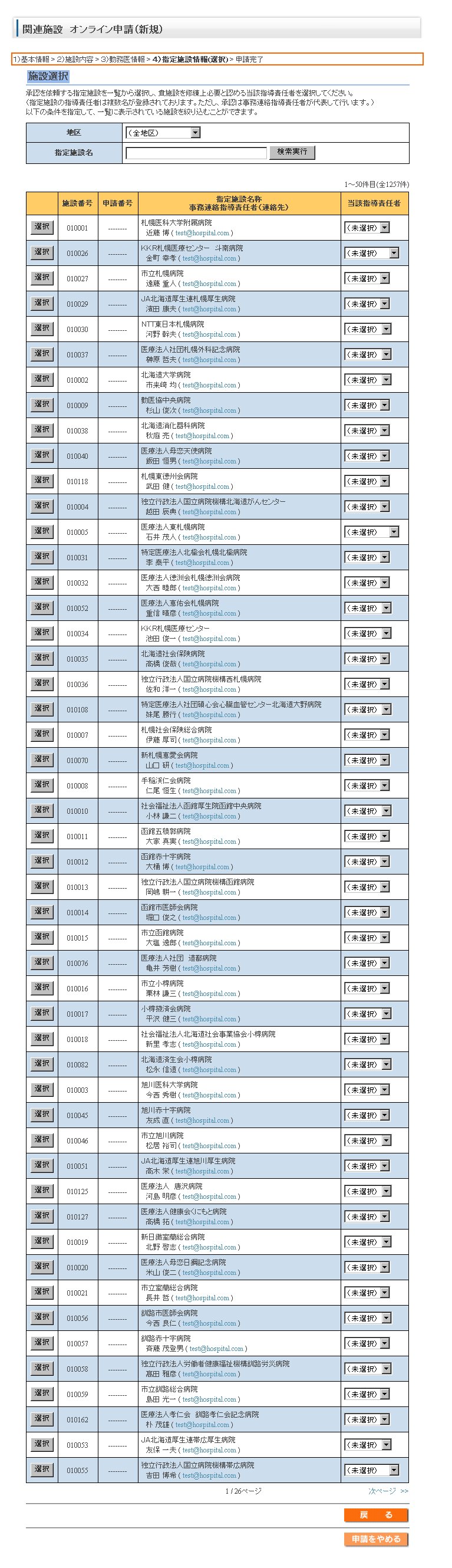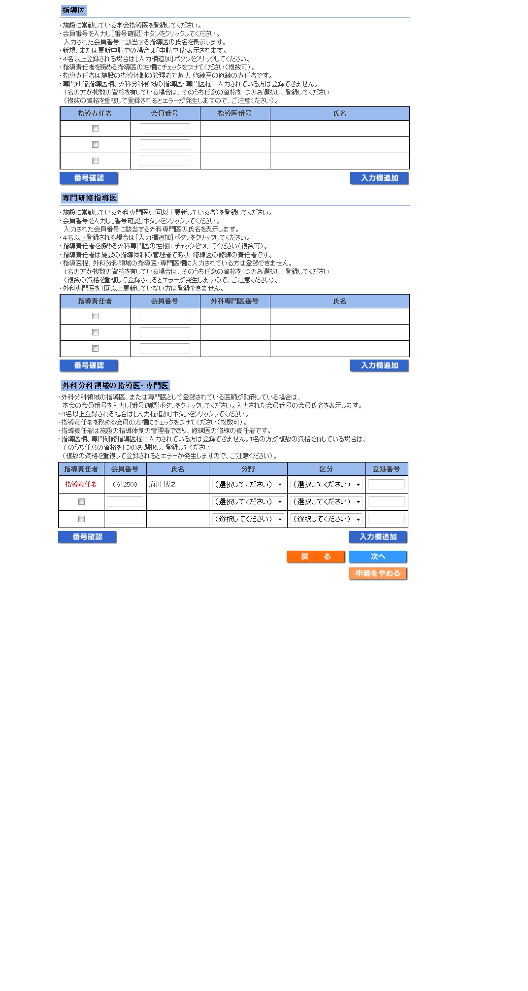 関連施設の申請について承認を依頼する指定施設、および関連施設を修練上認める当該指導責任者を1件以上選択する。